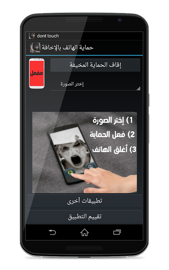 تتلخص فكرة التطبيق فى قفل الهاتف مع اختيار الصورة المخيفة التى سيتم عرضها عند فتح أحدهم الهاتف الخاص بك,وعندما يفتح أحدهم الهاتف ستظهر لهُ الصورة المخيفة التى اخترتها مسبقاً..